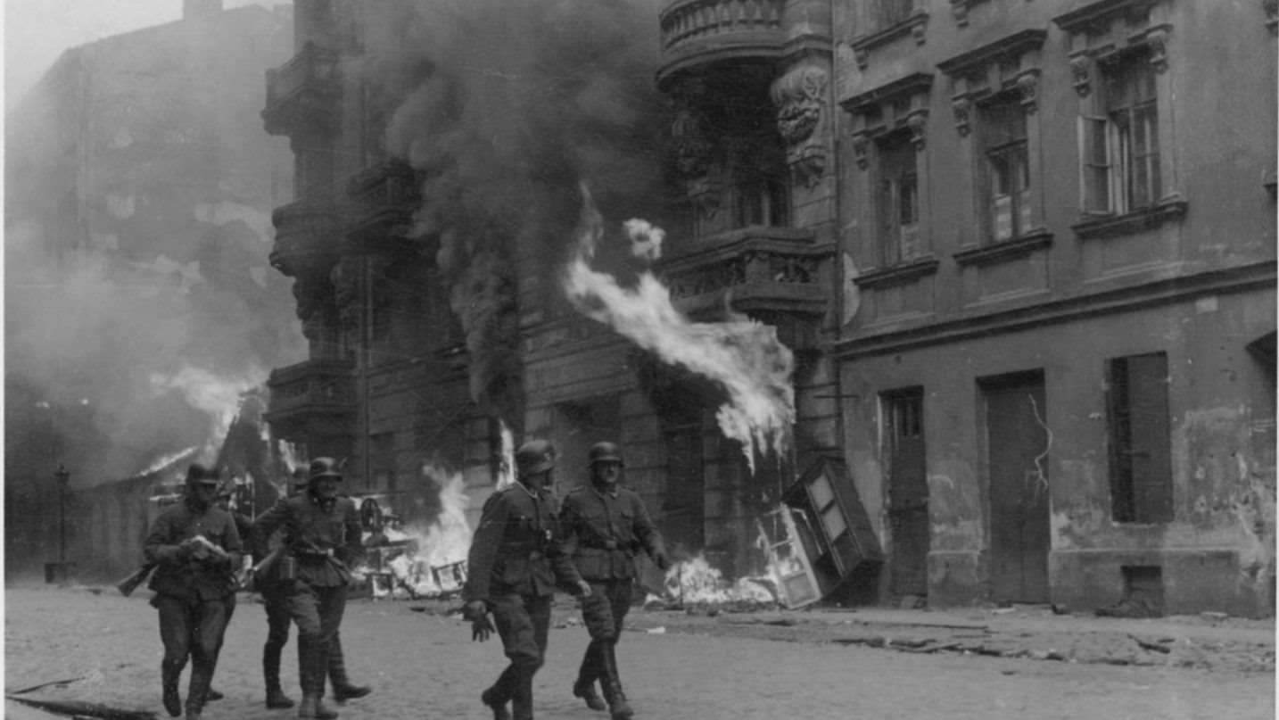 German Nazi SS men on the Nowolipie street of Warsaw Ghetto during the uprising, 1943. Credit: National archives catalog