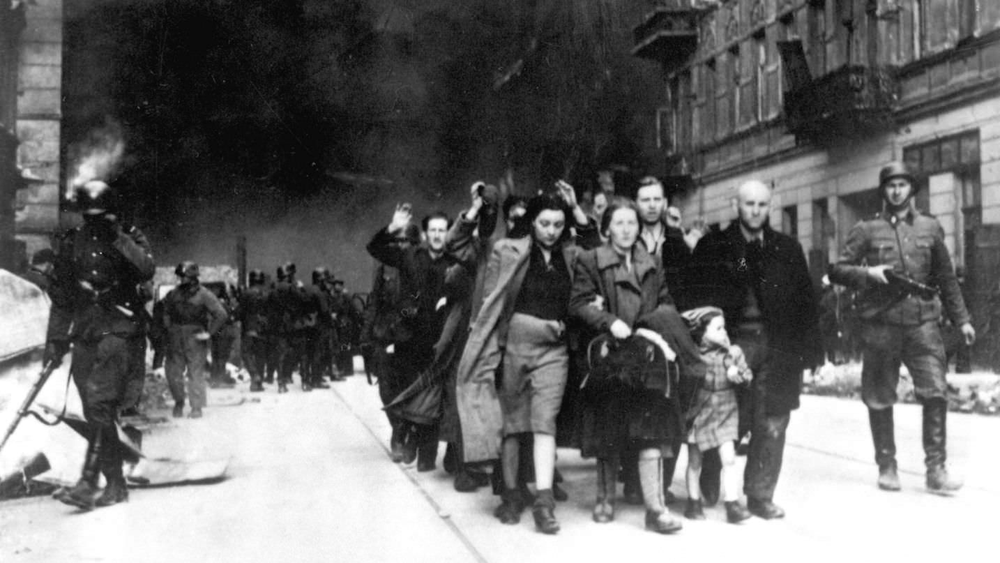 Jewish prisoners being led out of the Warsaw Ghetto following the uprising in 1943. Credit: WWII War Crimes Records