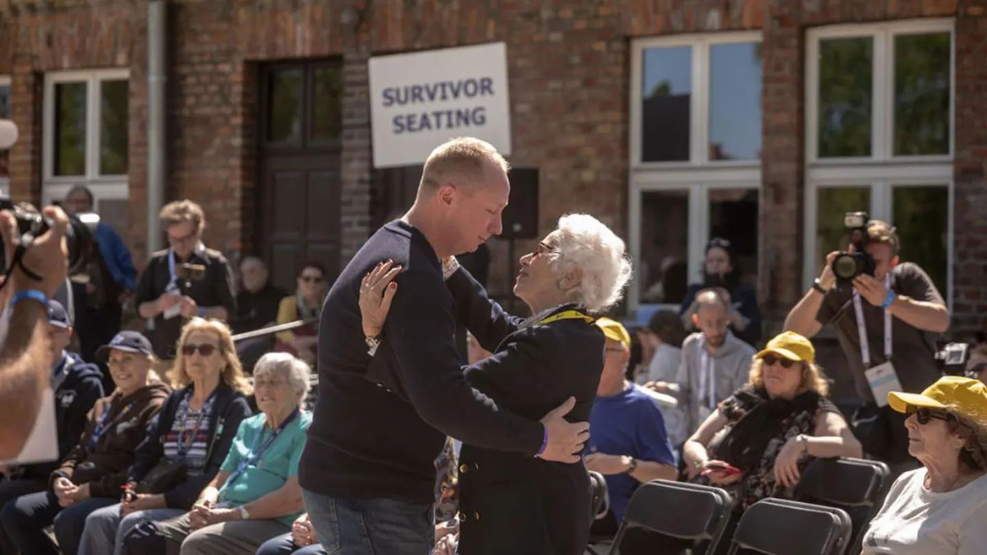 Reunion on the March of the Living of Merrill Eisenhower Atwater, the great grandson of General Dwight D. Eisenhower and Holocaust survivor Eva Clarke. Photo Credit: