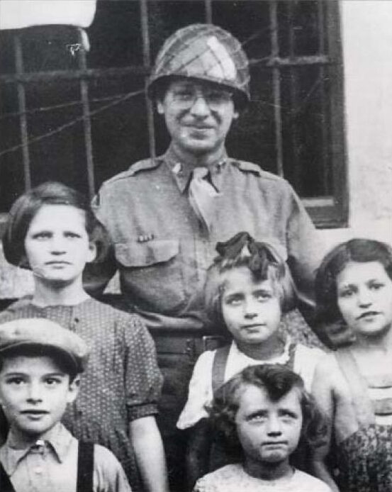 EB2. Chaplain Eli Bohnen with children in displaced persons camp, Bad Gastein, Austria, August 1945. Collection Mrs. Eli A. Bohnen. Credit: GIs Remember: Liberating the Concentration Camps – 1994, Mort Horvitz – National Museum of American Jewish Military History.