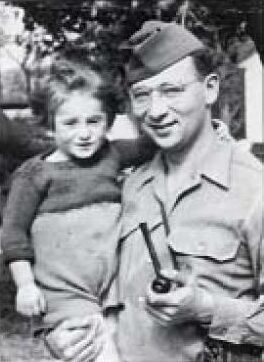 Eli Heimberg holding a three year old refugee from Poland, in Linz, Austria 1945. Collection Eli Heimberg. Credit: GIs Remember: Liberating the Concentration Camps – 1994, Mort Horvitz – National Museum of American Jewish Military History.